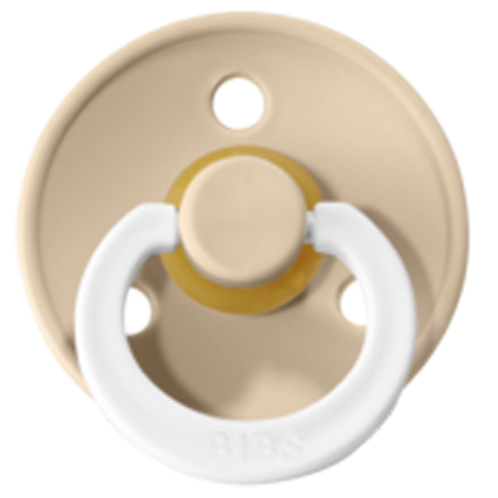 Farverig latex sut i vanilje, blød og sikker for småbørn (0-6 mdr). Let at rengøre og behagelig at bide i. Ideel til trøst og komfort.