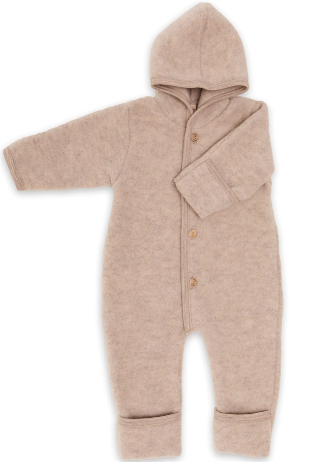 Denne ulddragt i sand melange er blød og varm, med hætte og ombuk til ekstra komfort. Den er holdbar, sikker og nem at rengøre, ideel til små børn.