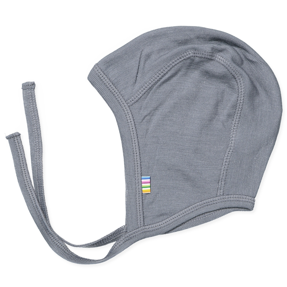 Denne grå babyhue i uld/silke er blød og varm, ideel til nyfødte. Den sikrer komfort og holder hovedet varmt, samtidig med at materialet er åndbart og skånsomt mod sart hud.