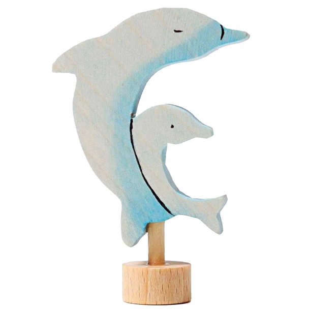 Dekorative delfiner i blødt træ, sikre for børn. Holdbare og farverige, perfekte til leg og indretning. Velegnede til børn fra 1 år.
