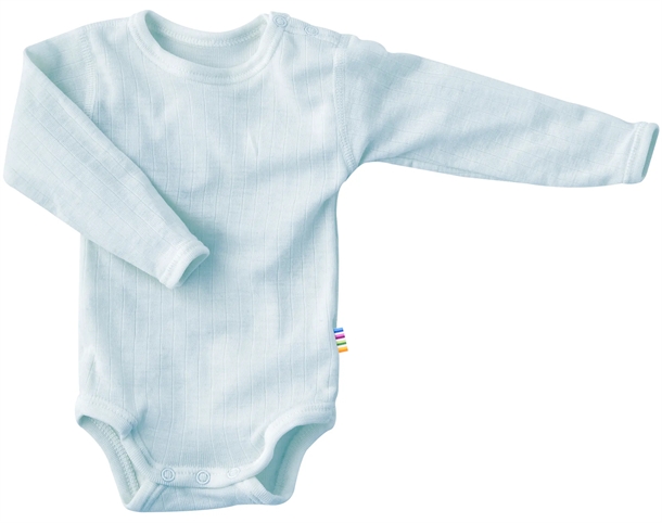 Joha uld body i lyseblå er blød og varm, ideel til sarte babyhud. Den er slidstærk og nem at vaske, perfekt til daglig brug.