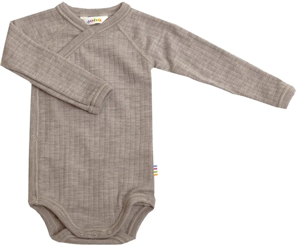 Joha Uld Body i Sesame Melange er blød og varm, perfekt til sarte babyhud. Slå-om designet sikrer nem påklædning og komfort hele dagen.