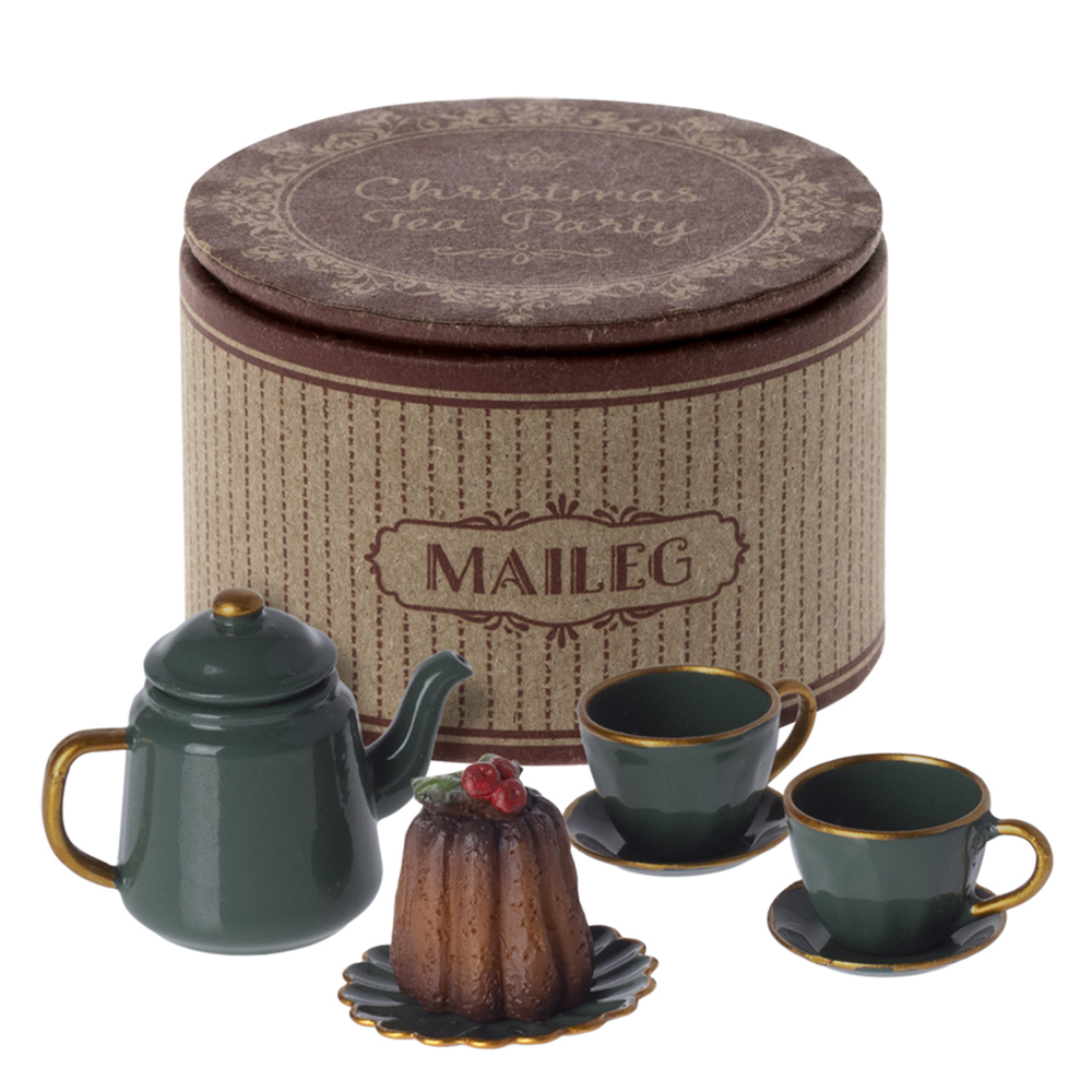 Jule teselskab til mus (One size) Hyg med din lille muse familie omkring et flot teselskabsbord. Sættet består af to tekopper, en tekande, en flot kage og en æske som kan bruges som bord. 14-4160-00