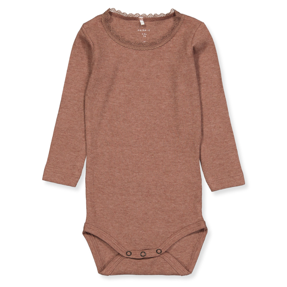 Kab rib body (1 mdr/56 cm) FIn elastisk blonde kant i halsen Cognac NBFKAB