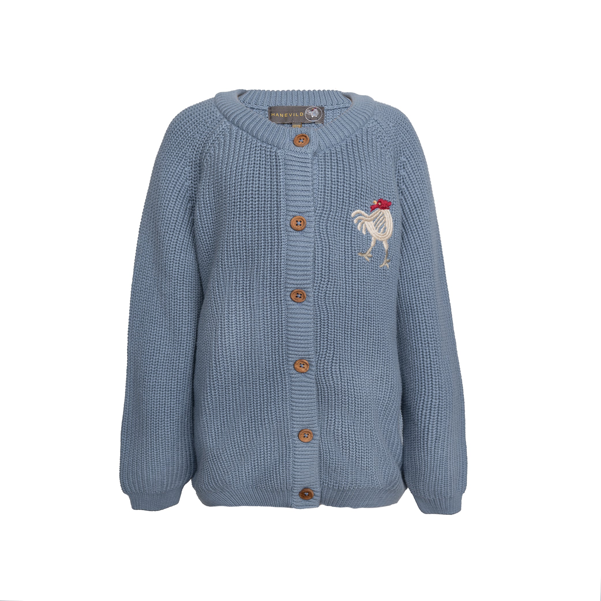 Cardigan in bright blue color, fastened with buttons made of dark wood. On the chest, there is a hand-embroidered rooster.Details:- 100% organic cotton- Wash at 30 degrees Celsius- Do not bleach- Lay flat to dry