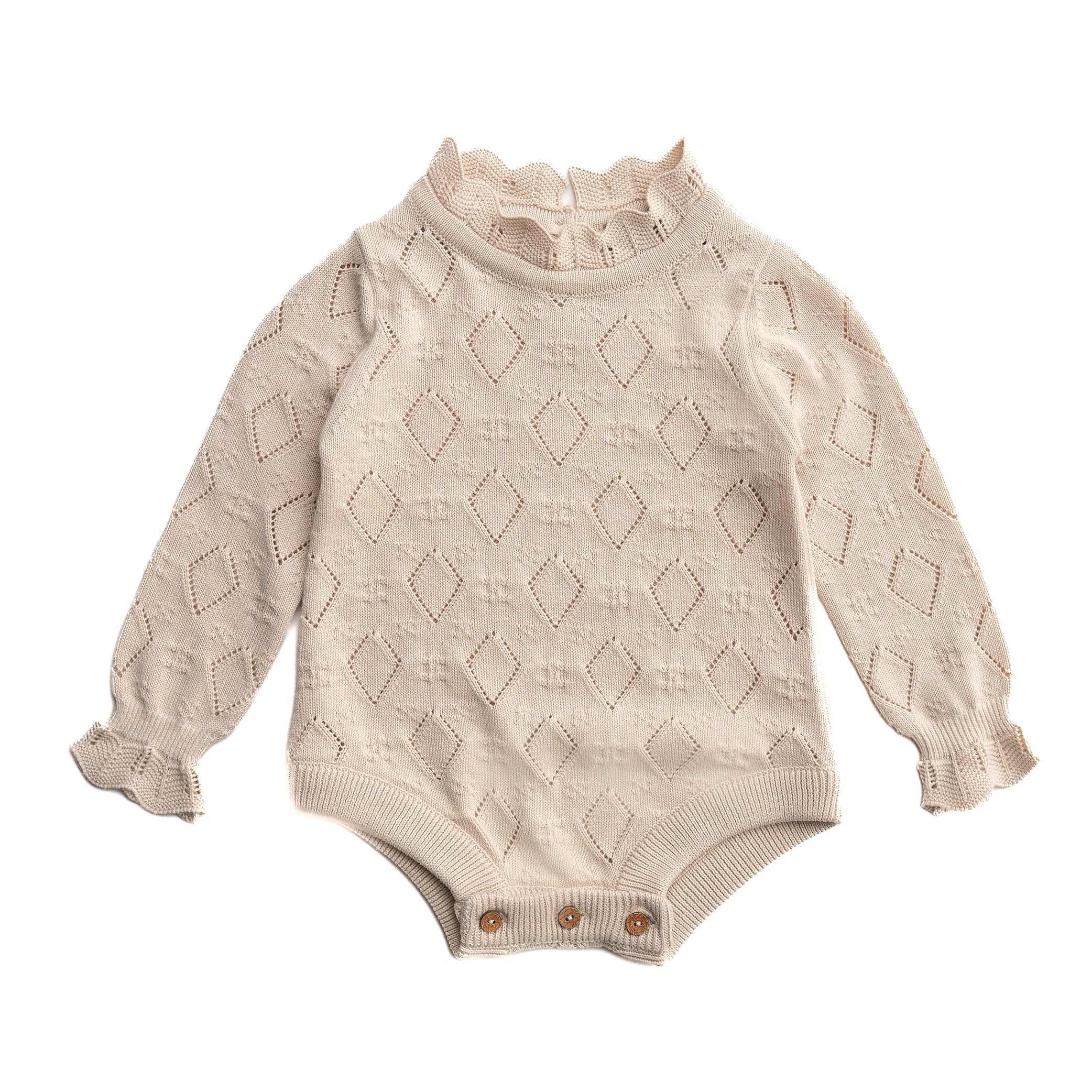 Den smukkeste body med fine detaljer over hele romperen.Vaskemaskine ved 30 grader.Må ikke tørretumblesMå ikke blegesskal ligge flat og tørre.