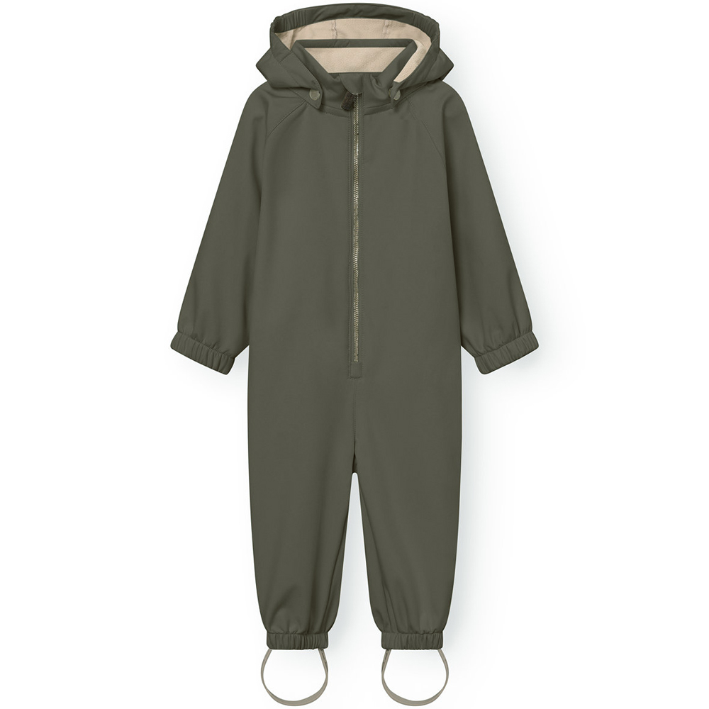 MATARNO softshelldragt (2 år/92 cm) – Aftagelig hætte – Elastik i ryggen – Aftagelige fodstropper – Fleecefoer Tarmac green MATARNO