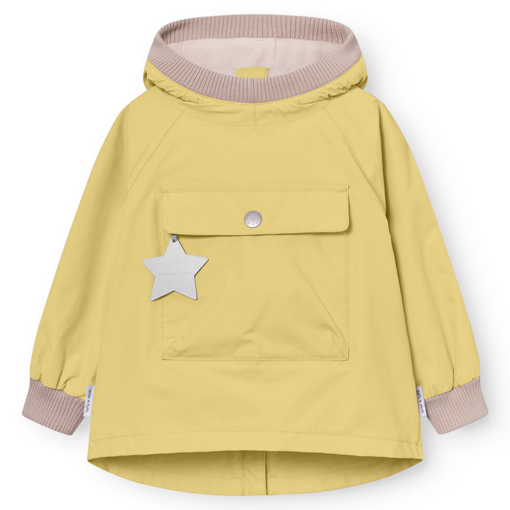 MATBABYVITO anorak med fleecefoer (12 mdr/80 cm) – Blødt fleecefoer – Vandsøjletryk: 12.000 mm – Åndbarhed: 8.000 – Vindtæt – Tapede sømme – Stor forlomme – Lynlås i ryggen – Blød rib kvalitet omkring hals, hætte og håndled – Stjernerefleks Dusky citron M