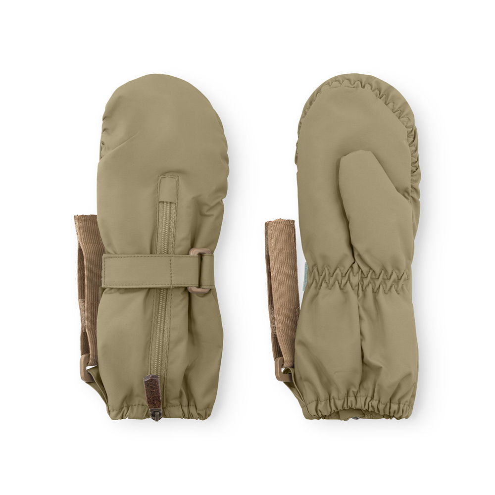 MATCESAR luffer (2-3 år) – Lynlåsen gør vanterne nemme at få af og på – Elastik ved håndleddet og åbningen giver en god pasform – Velcrostroppen kan sættes fast i Mini A Ture overtøj, så de ikke bliver væk Aloe green MATCESAR