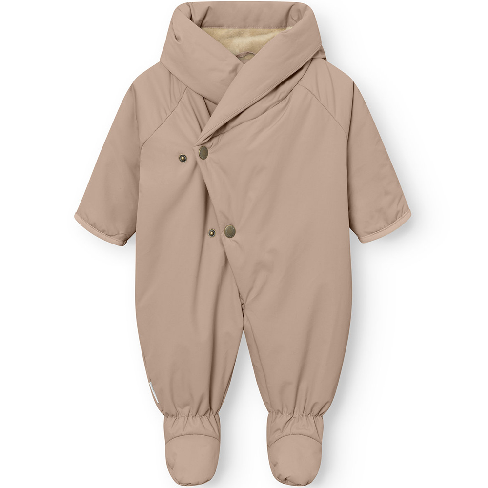 MATFIANNA køredragt (1 mdr/56 cm) – Indbyggede fødder – Blød fleece indvendig – Lukkes og justeres med snore – Hætte, der lukker behageligt rundt om babys hoved Savannah tan MATFIANNA