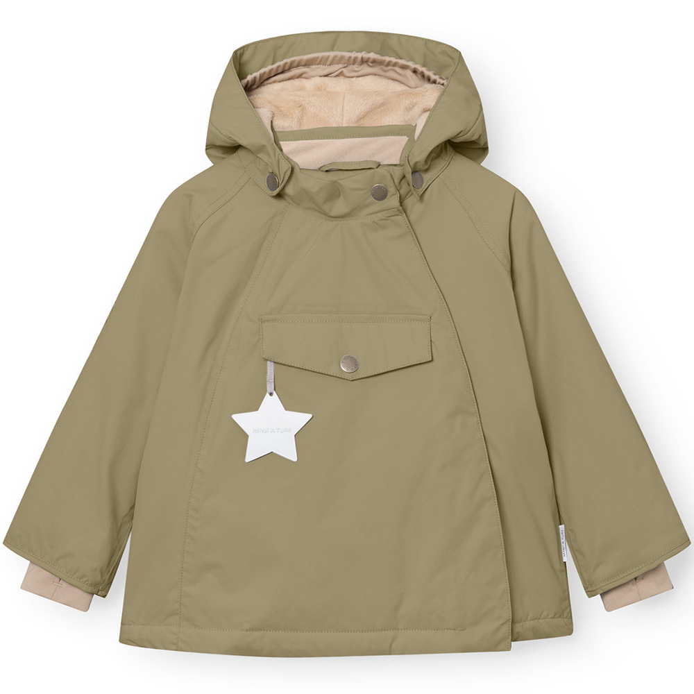 MATWANG vinterjakke (12 mdr/80 cm) – Aftagelig hætte med pelskant – Blød rib i halsåbningen – Brystlomme med flap og trykknap – Snemanchet ved begge håndled med hul til tommelfinger – 10 års garanti ved MINI A TURE Aloe green MATWANG