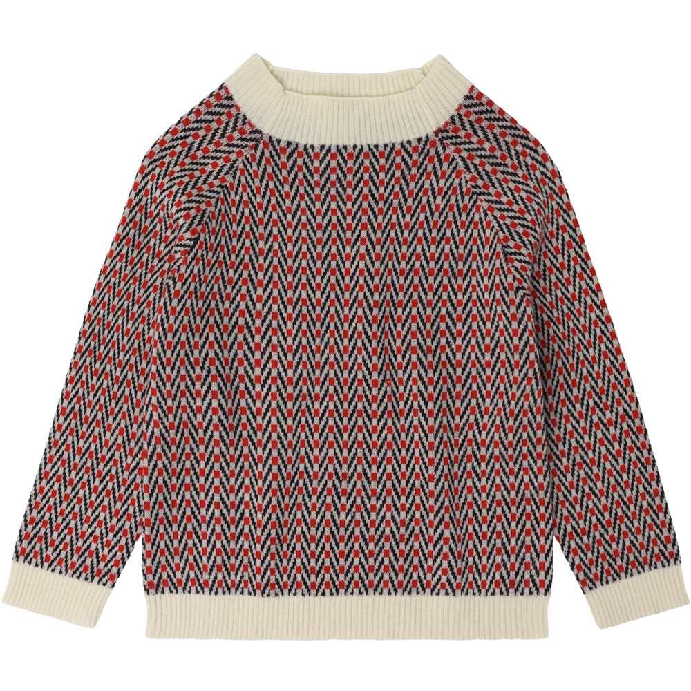 Denne striktrøje i merinould er blød og varm, ideel til leg og daglig brug. Den er slidstærk og nem at rengøre, perfekt til aktive børn.