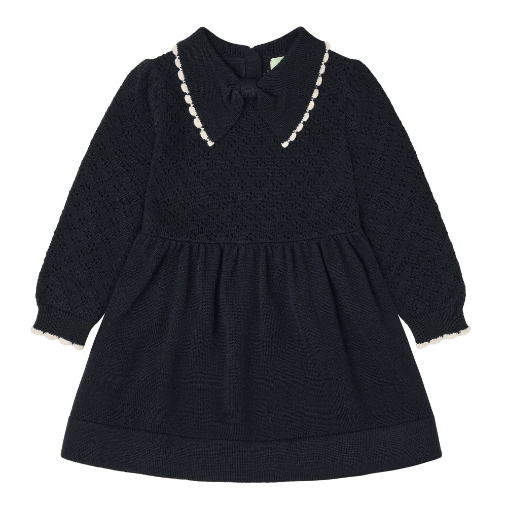 Lavet af blød merinould, sikrer denne kjole komfort og varme til dit barn. Holdbar og let at rengøre, perfekt til leg og hverdag. Velegnet til 18 måneder.