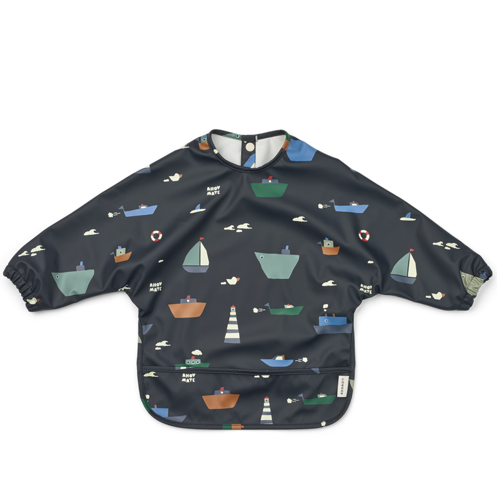 Merle spiseforklæde (One size) Lukkes med trykknapper i nakken, elastik i ærmer og lomme til mad, der falder ned. Mål: 82 cm fra ærme til ærme, H: 43 cm Sailing / Classic navy Merle