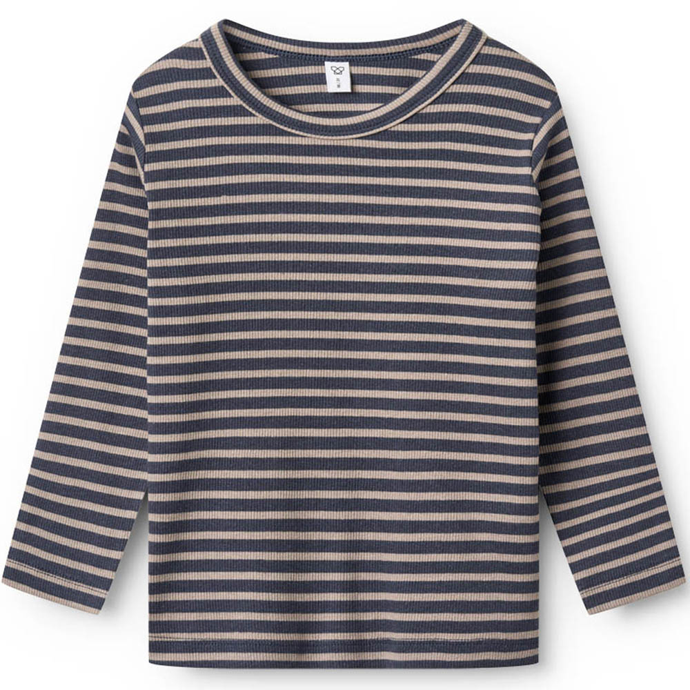 Milano bluse – modal rib (18 mdr/86 cm) Ribkvaliteten er en blanding af bomuld, modal og elastan, hvilket gør at den holder pasformen – selv efter lang tids brug. Dit barn vil elske den høje bevægelsesfrihed i denne rib. NAVY/BEIGE STRIPE MILANO
