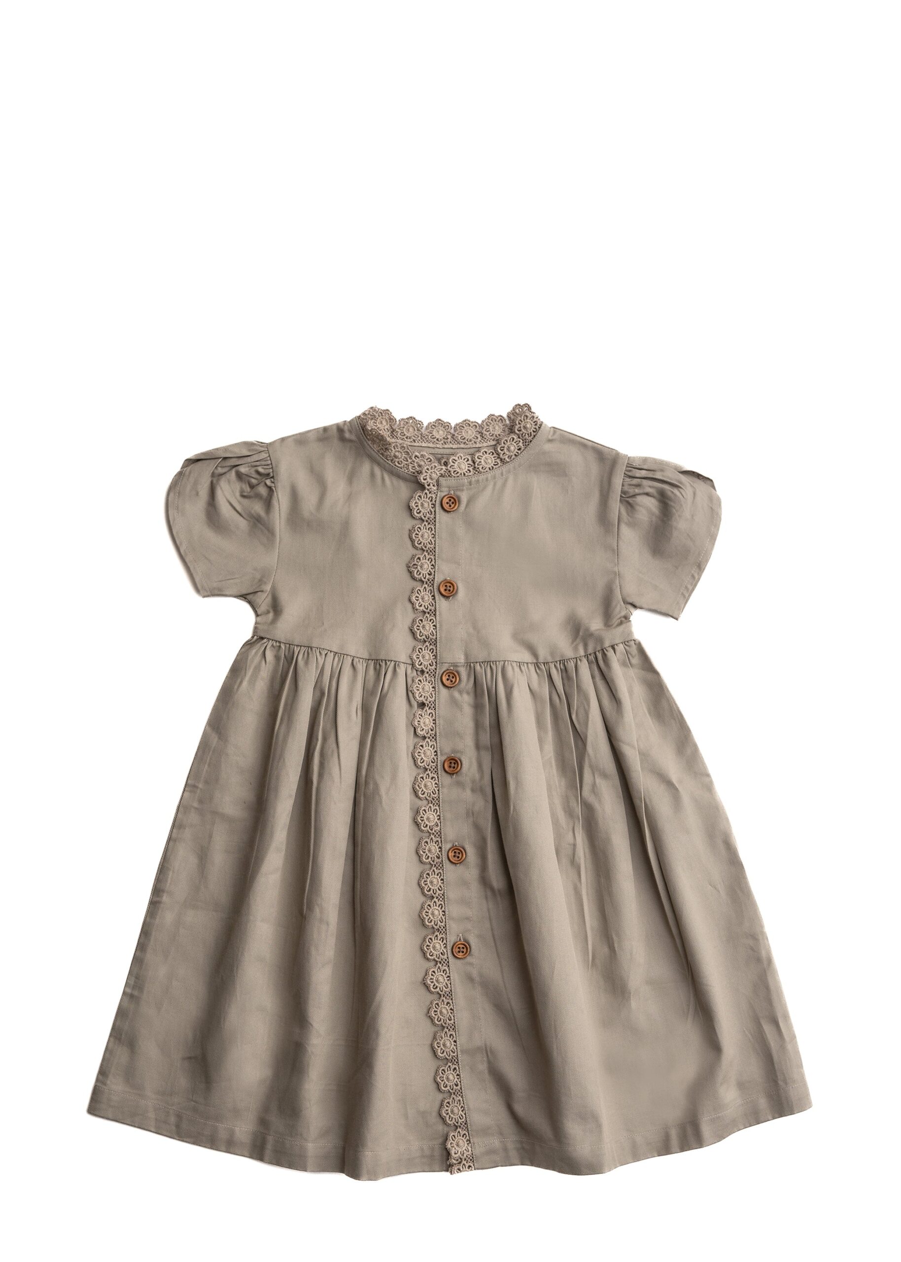 Kortærmet sommerkjole, med knapper på forsiden hele vejen ned hvor der også er monteret en blonde.lavet i en slidstærk, høj kvalitets 100% økologisk bomuld.Vaskemaskine ved 30 grader.Må ikke tørretumblesMå ikke blegeslægges flat ved tørring