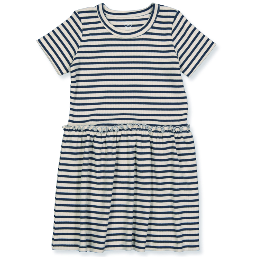Modena kjole – modal rib (3 år/98 cm) Ribkvaliteten er en blanding af bomuld, modal og elastan, hvilket gør at den holder pasformen – selv efter lang tids brug. Dit barn vil elske den høje bevægelsesfrihed i denne rib. Blue Nights/Turtledove Modena