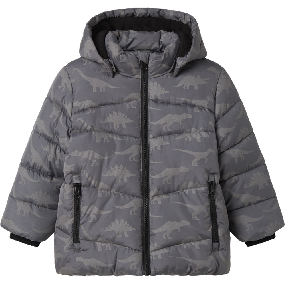 NMMMosan pufjakke (2 år/92 cm) – Ribkant ved ærmeåbning – Blødt fleecefoer indvendig – Dinosaurne fungerer som refleks på jakken Poppy Seed Nmmmosan