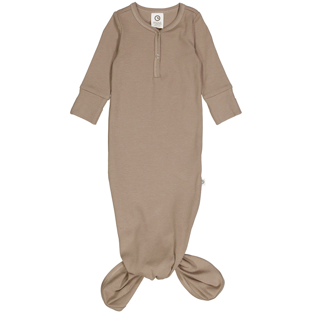 Organic rib heldragt (1 mdr/56 cm) Soveposedragt med knude lukning i bunden og praktisk ombuk ved hænderne. Dragten tilpasser sig barnet og giver en omsvøbende effekt. Walnut