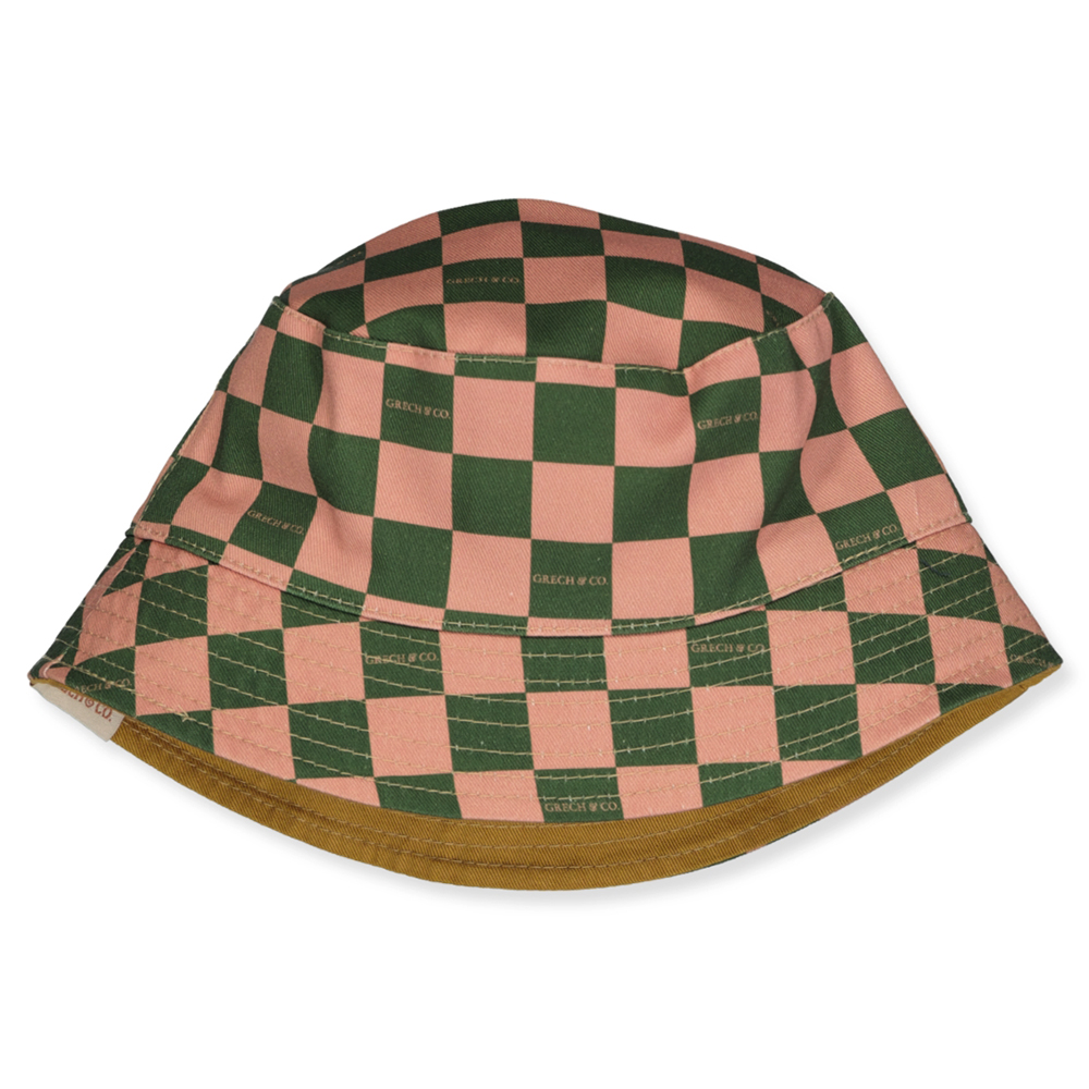 Organic vendbar bøllehat (48) Vendbar bøllehat 48cm.: 9 mdr. – 2 år 52cm.: 3 – 6 år Checks Sunset + Orchard