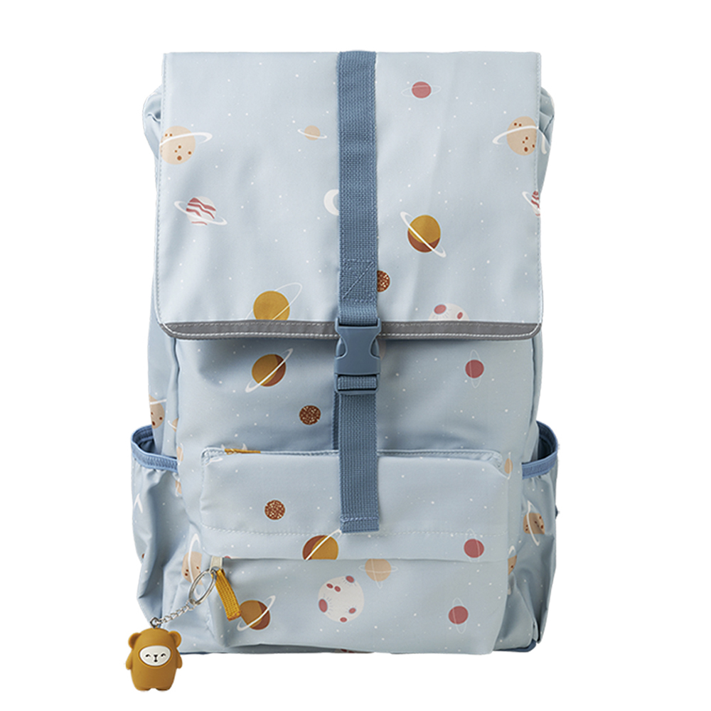 Planetary rygsæk – large (One size) – Justerbare remme med refleks – Hank – Klikspænder – Refleksbånd på klappen – Rygsækken snøres til inden i med en justerbar snøre – To sidelommer til drikkedunken – Lynlåslomme foran, og stort rum indeni rygsækken med