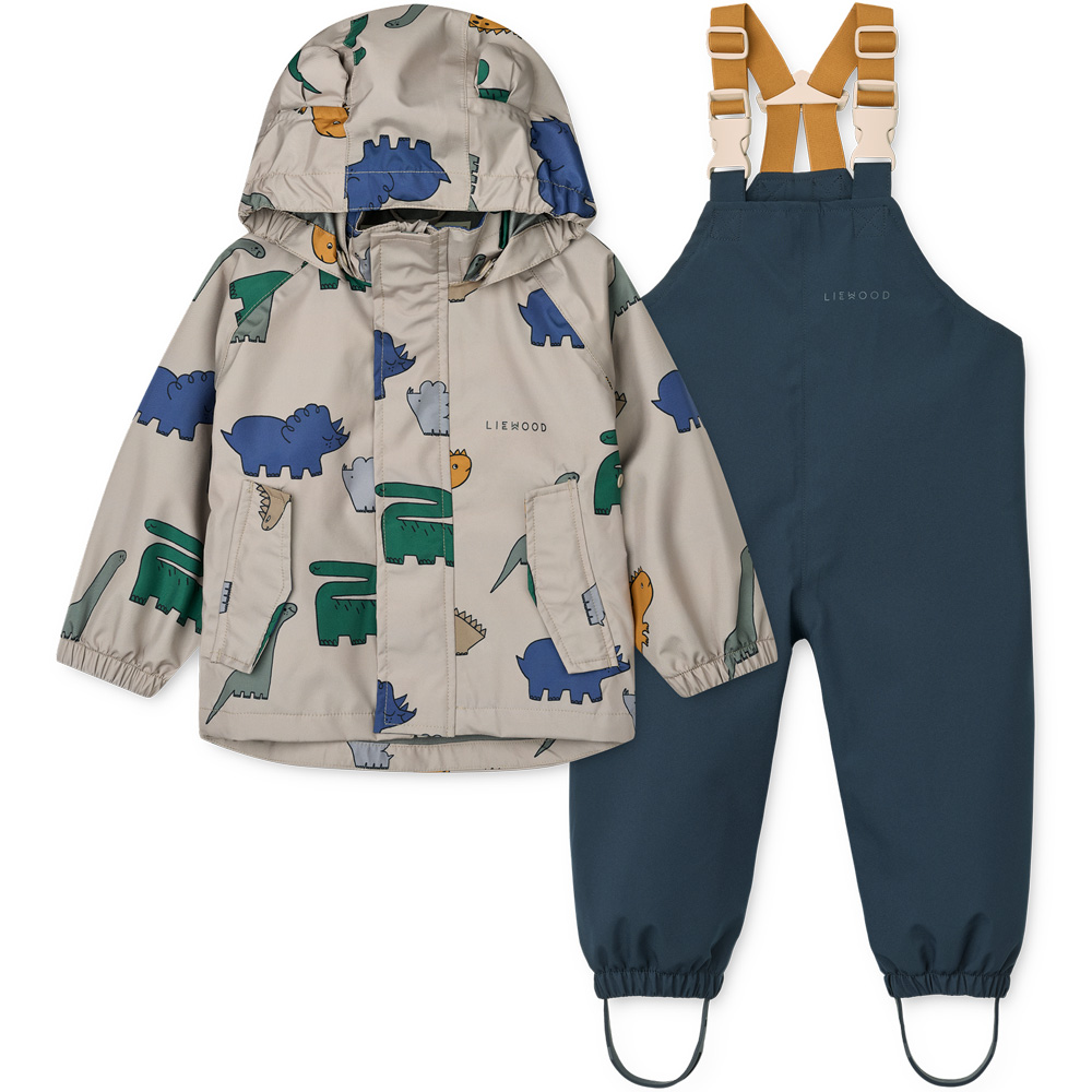 Recycled Manu regntøjssæt (18 mdr/86 cm) – Praktisk og legende regnsæt med dyreører og reflekser – Regnbukser med justerbare seler og silikonefodstropper – Forlommer med trykknapper Dinosaurs / Mist Manu