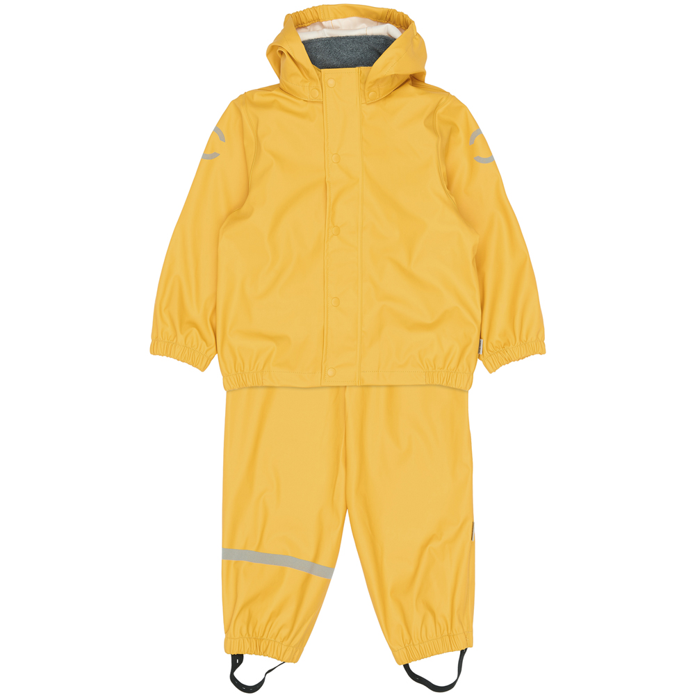Recycled regntøj (3 år/98 cm) – Fluorfri – Blødt fleece i halsudskæringen – Justérbar elastik i taljen – Vindtæt – Slidstærkt – Reflekser Sunflower