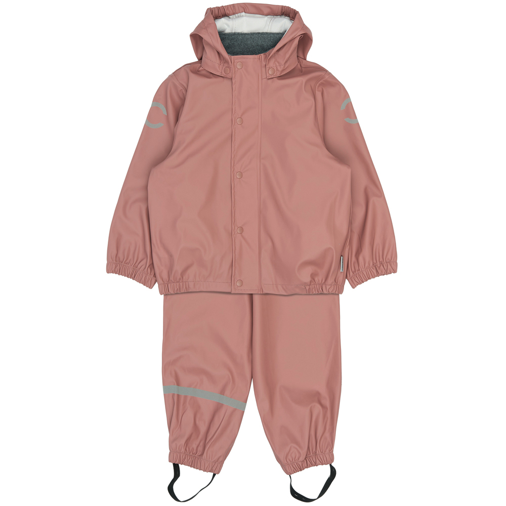 Recycled regntøj m/seler (12 mdr/80 cm) – Fluorfri – Blødt fleece i halsudskæringen – Justerbar elastik i taljen – Vindtæt – Slidstærkt – Reflekser Burlwood