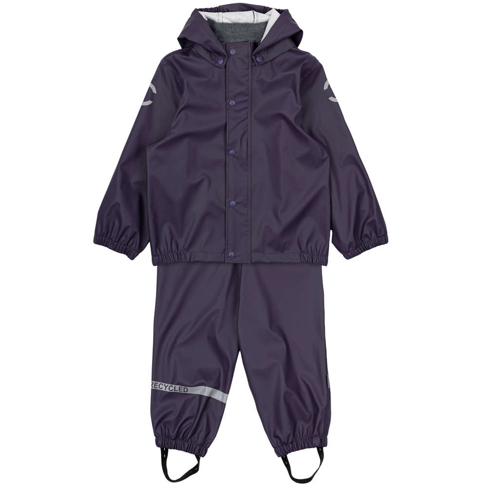 Recycled regntøj m/seler (18 mdr/86 cm) – Blødt fleece i halsudskæringen – Justérbar elastik i taljen – Vindtæt – Slidstærkt Nightshade