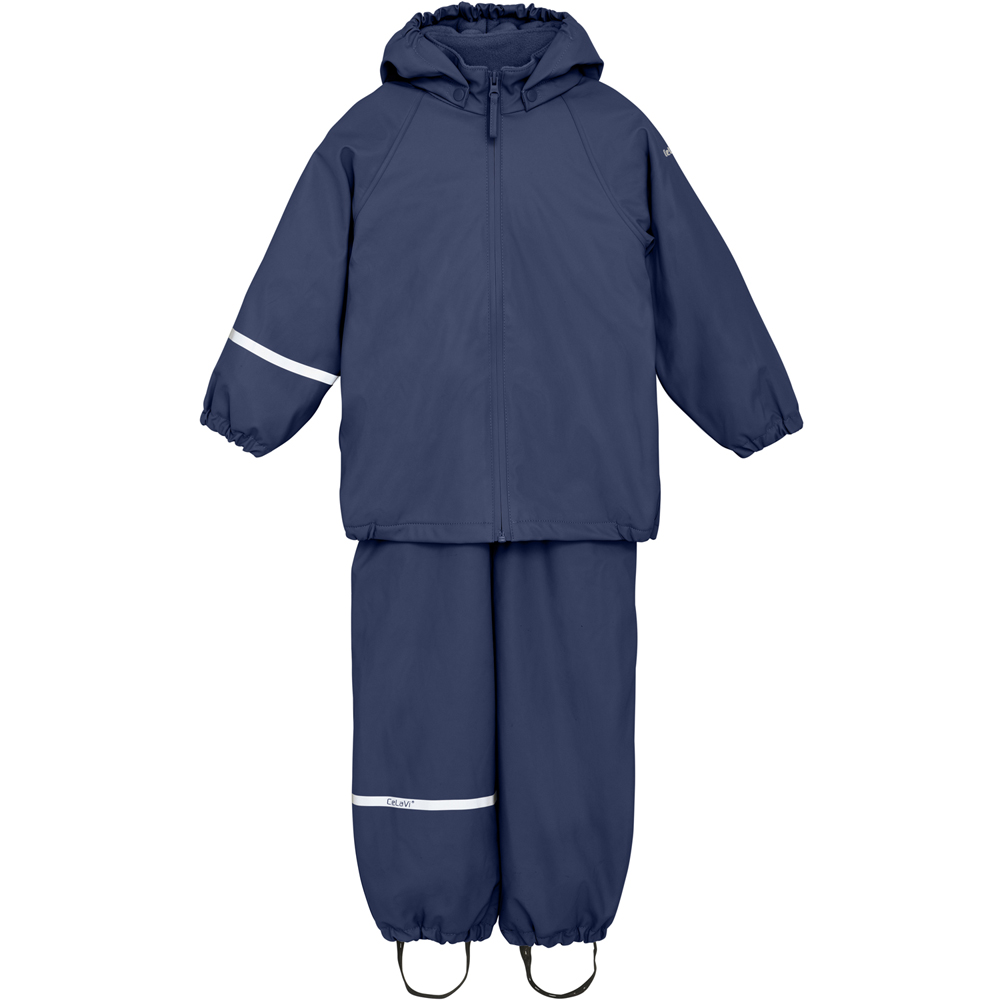 Regntøj m. fleece (100 cm) – Til og med størrelse 104 er regnbukserne lavet med justerbar seler og plastspænde fortil. – De kan lukkes i siden med en praktisk trykknap. – Fra størrelse 110 og op er bukserne lavet som bukser med elastik i taljen. – Justerb