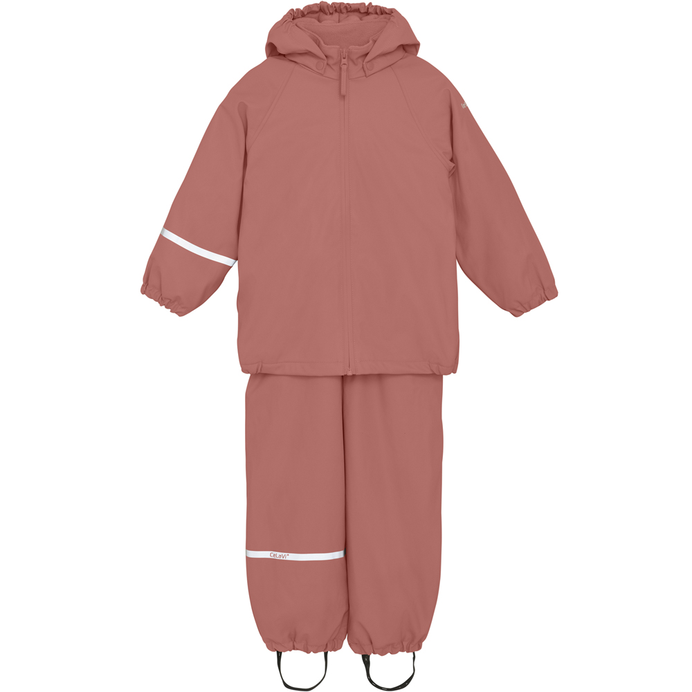 Regntøj m. fleece (100 cm) – Til og med størrelse 104 er regnbukserne lavet med justerbar seler og plastspænde fortil. – De kan lukkes i siden med en praktisk trykknap. – Fra størrelse 110 og op er bukserne lavet som bukser med elastik i taljen. – Justerb
