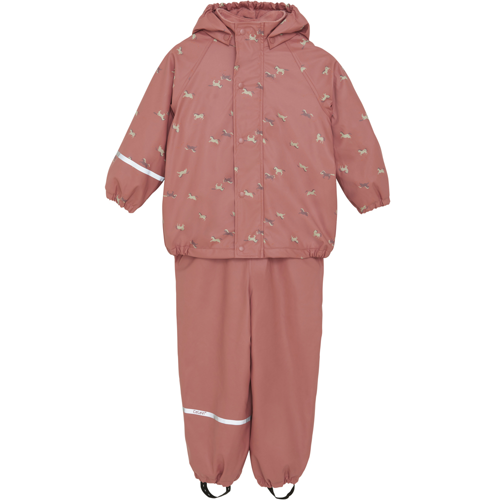 Regntøj m. fleece (90 cm) – Til og med størrelse 104 er regnbukserne lavet med justerbar seler og plastspænde fortil. – De kan lukkes i siden med en praktisk trykknap. – Fra størrelse 110 og op er bukserne lavet som bukser med elastik i taljen. – Justerba