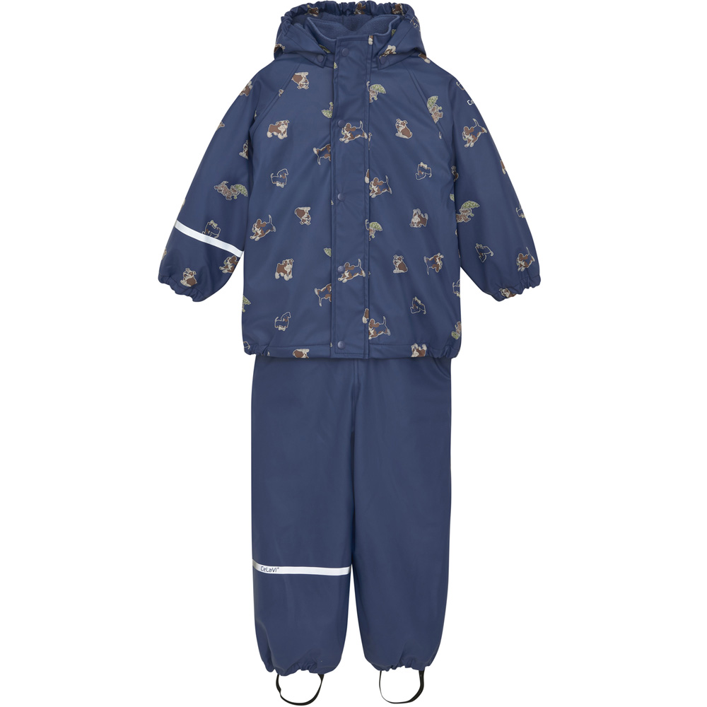 Regntøj m. fleece (90 cm) – Til og med størrelse 104 er regnbukserne lavet med justerbar seler og plastspænde fortil. – De kan lukkes i siden med en praktisk trykknap. – Fra størrelse 110 og op er bukserne lavet som bukser med elastik i taljen. – Justerba