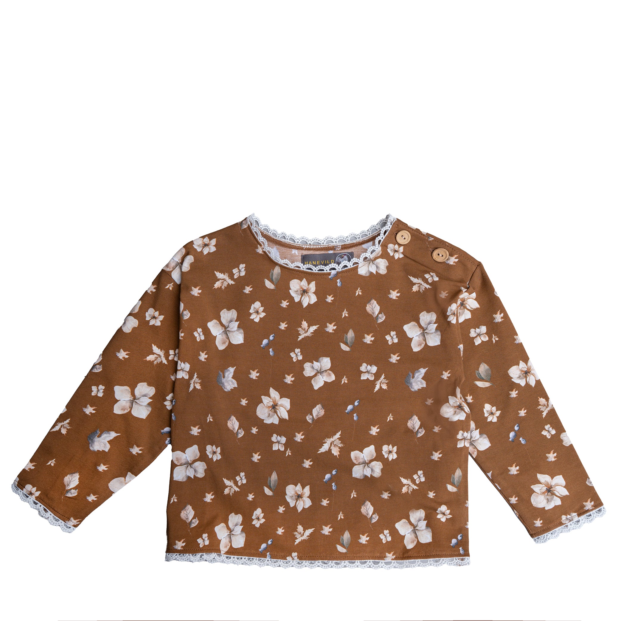 Langærmet bluse med fint print i superblødt økologisk bomuld.- fin blondekant i hals, ærmer og bund.- print med efterårets blade.lavet i en slidstærk, høj kvalitets økologisk bomuld.Vaskemaskine ved 30 grader.Må ikke tørretumblesMå ikke bleges