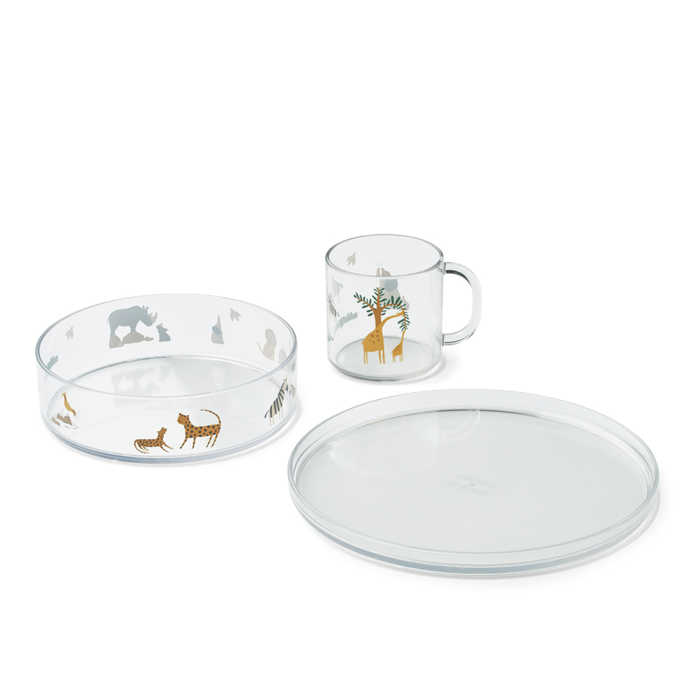 Siva spisesæt (One size) Klart spisesæt i yderst holbart tritan, med rigtig flotte prints på. Spisesættet består af en skål, tallerken og kop. Sættet kan gå i opvaskemaskine i op til 60 grader. Kop: D: 7 cm, H: 7 cm, 80 ml Skål: D: 15 cm, H: 4,3 cm, 580 m