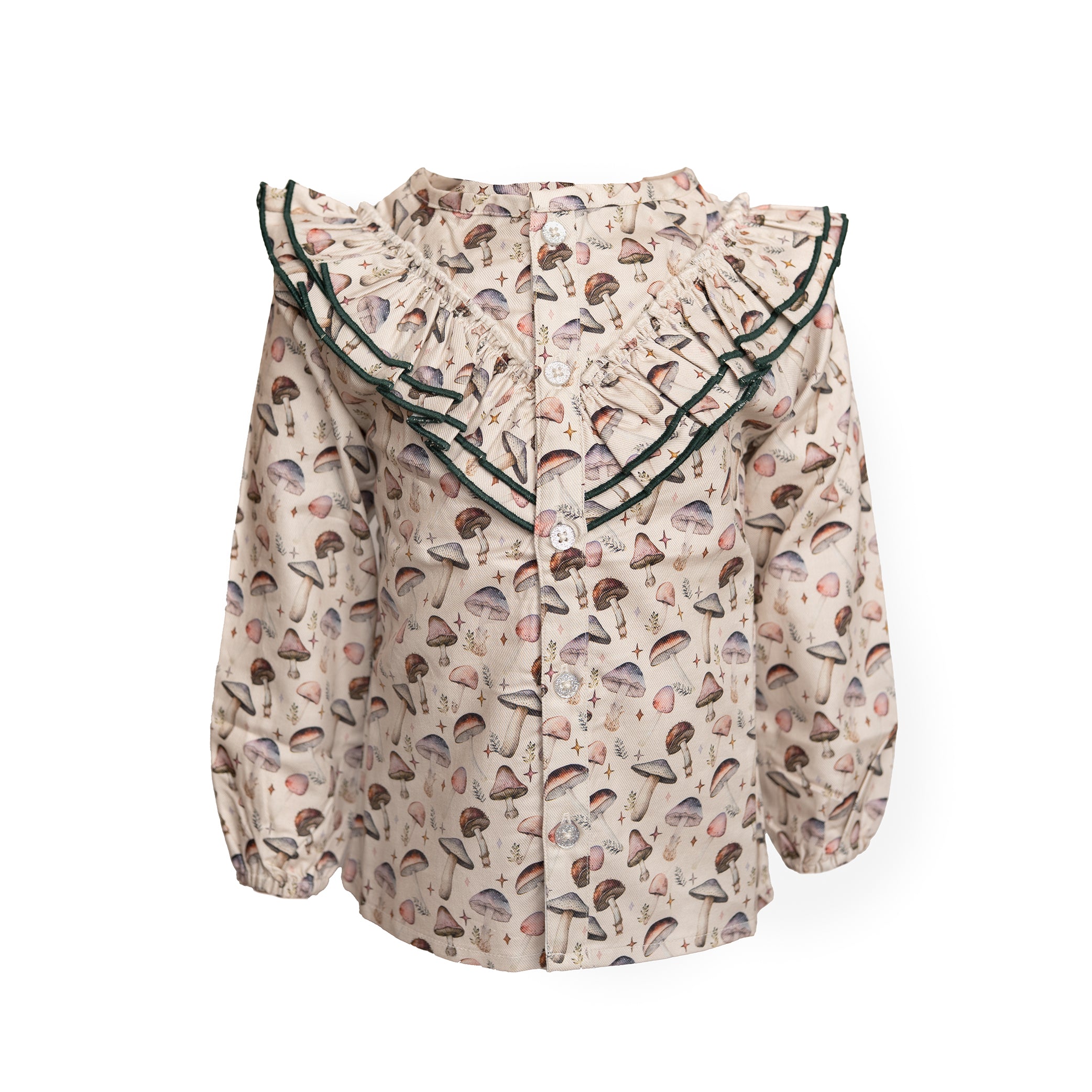 Skjorte med svampeprint i blødt bomuld. På skuldrene er der en dobbeltflæse som rækker ind over brystet. Skjorten lukkes med fine glimmerknapper.Detaljeret:- 100 % bomuld- Vaskes ved 30% grader- Må ikke bleges – Lægges fladt til tørring