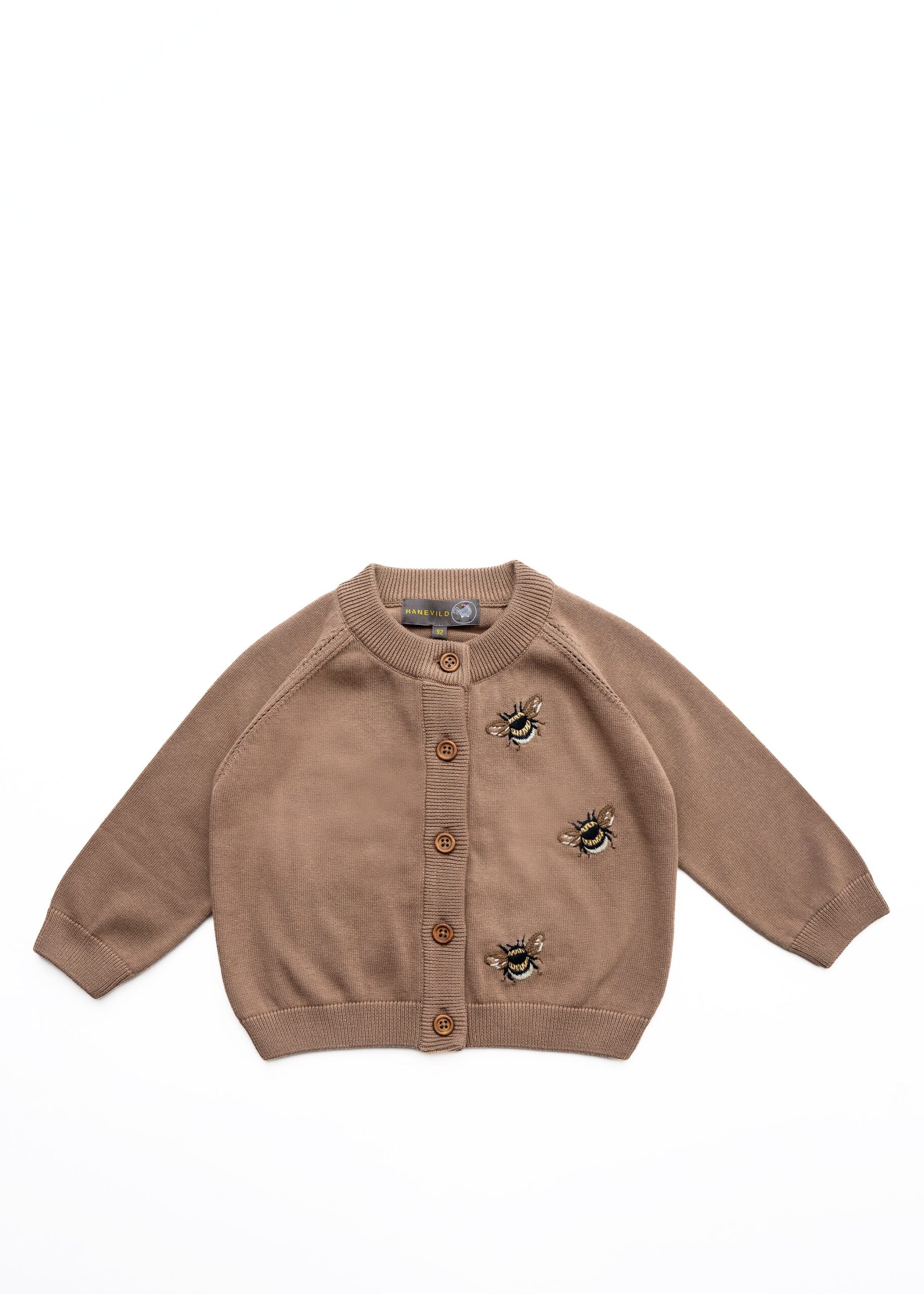 Den smukkeste cardigan med fine humlebier broderet i hånden på den ene side.lavet i en slidstærk, smørblød, høj kvalitets 100 % økologisk bomuld.Vaskemaskine ved 30 grader.Må ikke tørretumbleMå ikke blegesskal ligge flat og tørre.