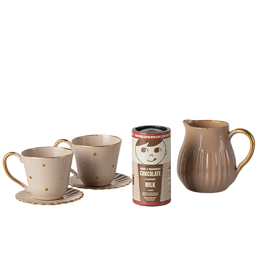 Varm chokolade sæt – Mini (One size) Dæk op til en kop varm chokolade med dette smukke sæt. Sættet indeholder 2 kopper, 2 tallerkner, én gryde og chokolade. Sættet er lavet i størrelse mini og passer til Teddy familien, kaniner og harer størrelse 1 og 2.