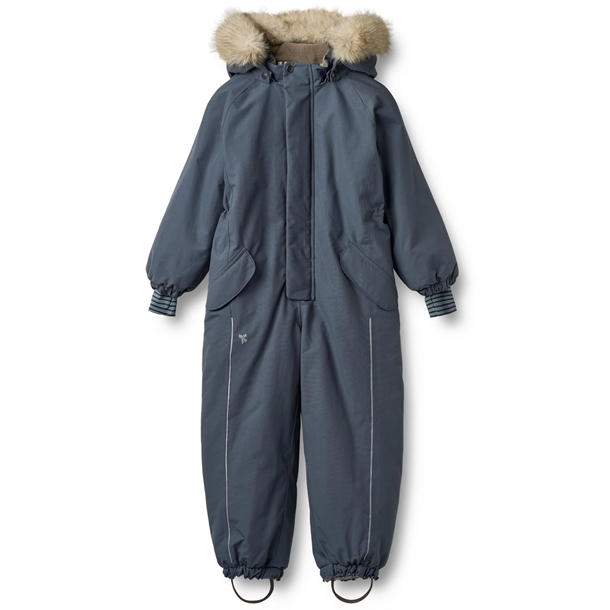 Wheat Flyverdragt i gråblå er både blød og slidstærk, sikrer komfort og bevægelsesfrihed. Perfekt til leg i al slags vejr og nem at rengøre.